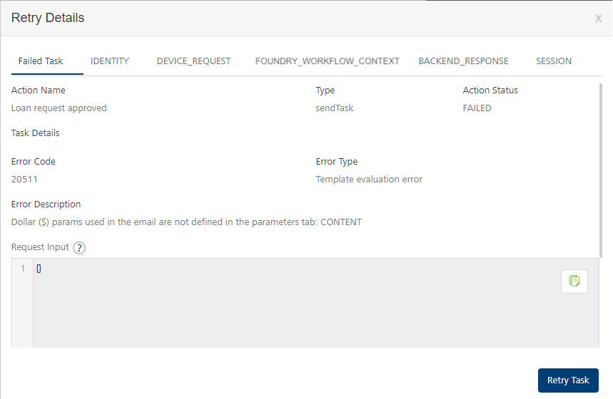 Note: For Event triggered workflows, the Retry functionality works the same as in the case of object triggered workflows. When a task/node is failed, the workflow execution status goes to failed status. To view the actual error that has caused to failed the task, click the Retry icon next to the FAILED status of a service node/task. Error details of each failed tasks are displayed in the Admin Console > Retry Details dialog box. These error details help you to troubleshoot the issue and then retry the task again. The Retry Details dialog box displays the workflow namespaces error data in six tabs, as follows:
