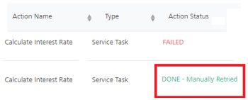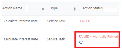 | Action Status - Retry | Status Retry icon is displayed next to the task failed status. Helps you to trigger a failed task again manually. RetryTaskFailedButton 1Note: To view the actual error that has caused to failed the task, click the Retry icon next to the FAILED status of a service node/task. FAILED - Manually Retried (including the Retry icon). For a success case, the status as DONE - Manually Retried.![]() For more information on how to fix a failed task and execute the workflow again, refer to How to Retry a Failed Task of a Workflow. |