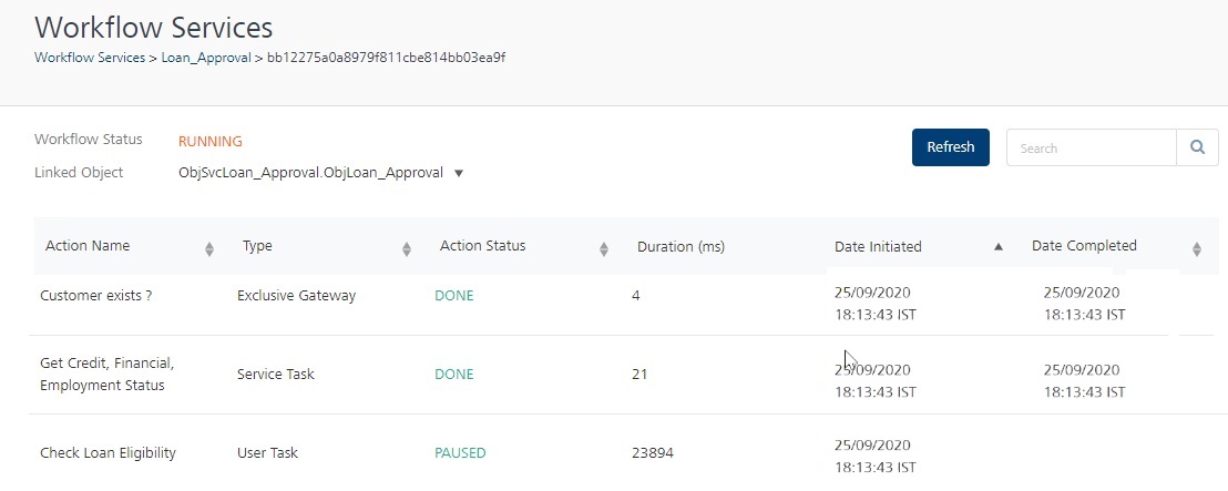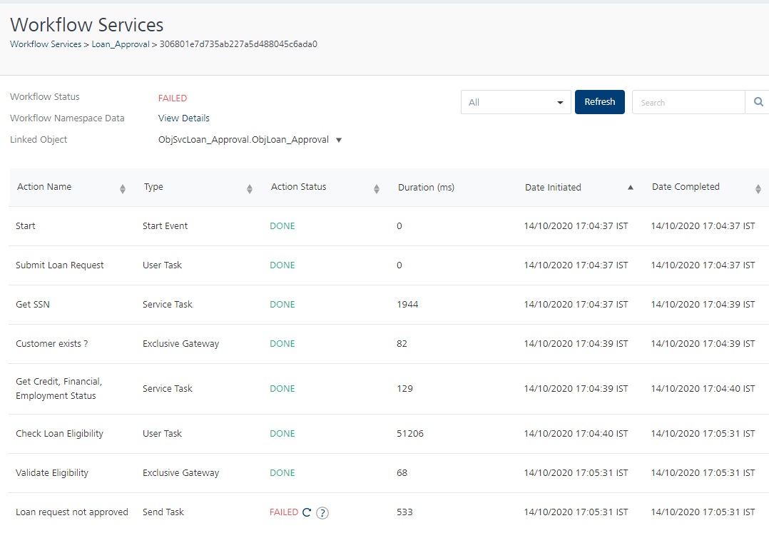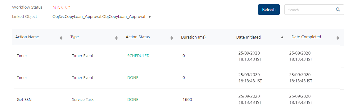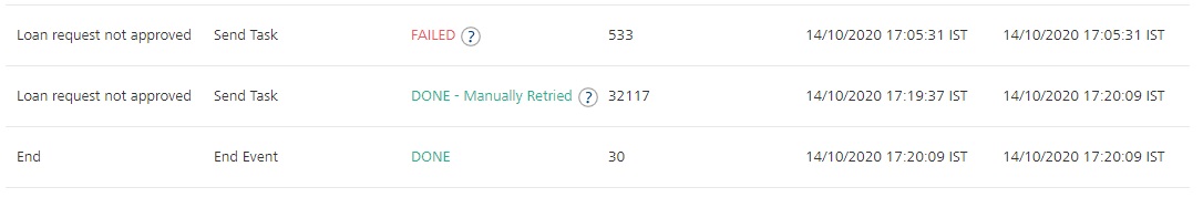 | Action Status | Displays the current status of the node/task, such as Done, Scheduled, Paused, or Failed. Status: Done - when a task/node is completed successfully: Status: Scheduled is applicable only for the Timer node. The status is initially Scheduled until the delay time lapses and then the Timer will again get audited as Done when the Timer node is completed successfully: Status: Paused - when a task/node is waiting for a user action, for example, User Task. Status: Failed - when a task/node did not execute successfully. Clicking on the Failed link displays the error information in a pop-up window. When any task fails, an exception is logged in the middleware.log includes the wfName and wfInstID parameters. These parameters help you to debug the issues that caused for the task failure. For example, when service task is failed, this is one exception being logged in logs. Sample middleware log of a Failed workflow service task:[app.services][ERROR][2020-05-26T21:01:50.360+05:30]:[9eee071d-15f4-4e1a-9aa1-d7de8cb0507d]:[]:[TENANTENVID=4efd7c61-6c83-4ede-b8f7-85db87d6a2a3,svc=AccountOpenService,op=Account,wfName=loopWf,wfInstID=f3478ab0b150a2f5fa60c037328c8f15]:[VOLTMX-SERVER-EVENTS-CONSUMER-THREAD-POOL-1]:[com.voltmx.rules.exception.RulesException:<init>:32]:MW30002: ScriptException - Property access failed in MVEL script causing exception [Error: could not access property: response; parent is null: FOUNDRY_WORKFLOW_CONTEXT..] [Near : {... FOUNDRY_WORKFLOW_CONTEXT.. ....}] ^ [Line: 1, Column: 1]. org.mvel2.PropertyAccessException: [Error: could not access property: response; parent is null: FOUNDRY_WORKFLOW_CONTEXT..] [Near : {... FOUNDRY_WORKFLOW_CONTEXT.. ....}] ^ [Line: 1, Column: 1] at org.mvel2.optimizers.impl.refl.ReflectiveAccessorOptimizer.optimizeSetAccessor(ReflectiveAccessorOptimizer.java:200) ~[mvel2-2.4.3.Final.jar:?] at org.mvel2.optimizers.dynamic.DynamicOptimizer.optimizeSetAccessor(DynamicOptimizer.java:95) ~[mvel2-2.4.3.Final.jar:?] at org.mvel2.compiler.CompiledAccExpression.setValue(CompiledAccExpression.java:54) ~[mvel2-2.4.3.Final.jar:?] at org.mvel2.ast.DeepAssignmentNode.getReducedValueAccelerated(DeepAssignmentNode.java:90) ~[mvel2-2.4.3.Final.jar:?] at org.mvel2.MVELRuntime.execute(MVELRuntime.java:85) ~[mvel2-2.4.3.Final.jar:?] at org.mvel2.compiler.CompiledExpression.getDirectValue(CompiledExpression.java:123) ~[mvel2-2.4.3.Final.jar:?] at org.mvel2.compiler.CompiledExpression.getValue(CompiledExpression.java:119) ~[mvel2-2.4.3.Final.jar:?] at org.mvel2.compiler.CompiledExpression.getValue(CompiledExpression.java:113) ~[mvel2-2.4.3.Final.jar:?] at org.mvel2.MVEL.executeExpression(MVEL.java:941) ~[mvel2-2.4.3.Final.jar:?] at com.voltmx.rules.mvel.handlers.MVELExecutor.execute(MVELExecutor.java:26) ~[middleware-rules-1.0.0.0.jar:?] at com.voltmx.component.service.ServiceInvocationComponent.executeScript(ServiceInvocationComponent.java:150)For more information to download middleware logs, refer to Standard Logs > Cloud Logs > Archived Logs |