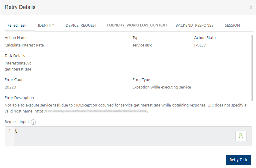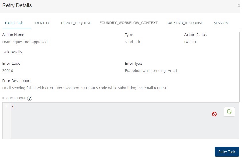 | Failed Task | Action Name: Displays the name of the failed task. Type: Displays the type of the failed task. Action Status: Displays the status of the failed task. Task Details: Displays the service and operation name only if the failed task type is a Service task. Error Code: Displays the error code of the failed task. Error Type: Displays the error type of the failed task. Error Description: Displays the description of the failed task. Request Input: The Request Input tab is always displayed, but the JSON payload is shown only in case of a failed task type as Service Task. For other types of failed tasks, this section is empty. Retry Task button helps you to retry the task. | |