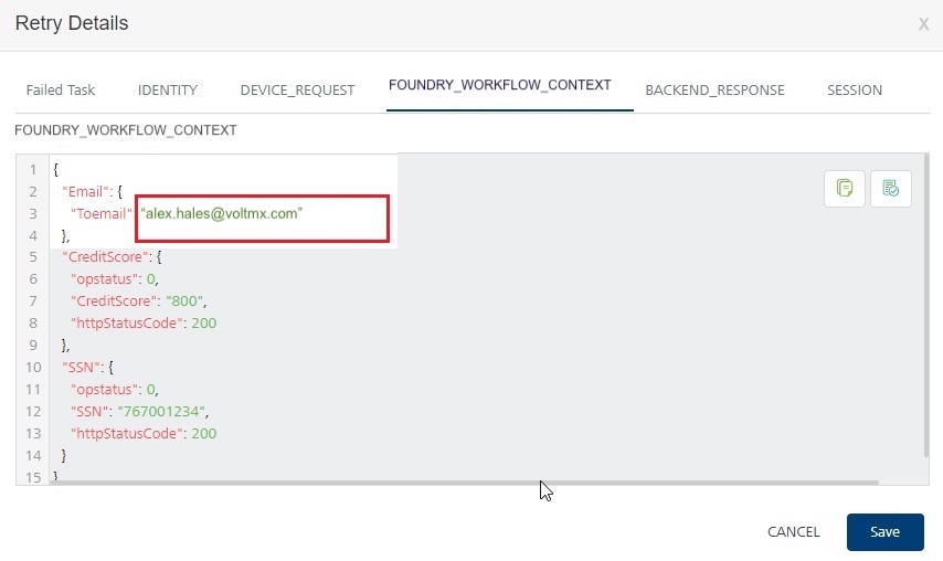 - Workflow Namespace Data: Click View Details to view the Namespace data available in FOUNDRY_WORKFLOW_CONTEXT in a JSON format. This displays the latest details of the workflow context data scope as per the workflow execution status. If a user modifies the workflow_context data via the Retry Details dialog box, the same is also reflected here. This modal is read-only.