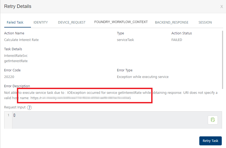 Use Case: In this example, in the Loan_Approval sample application, due to a wrong back-end URL, the Calculate Interest Rate service task is failed. Here, the back-end server is unable to process the request. In the following sample screen shot, the back-end URL has missing of one slash (/).