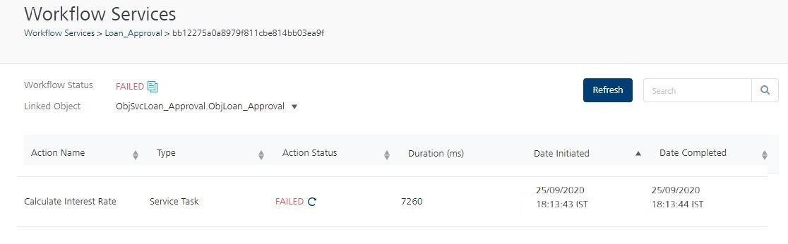 When a task/node is failed, the workflow execution status goes to failed status. To view the actual error that has caused to failed the task, click the Retry icon next to the FAILED status of a service node/task.
