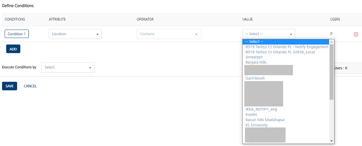 - For the user attribute as Location, select the location from the drop-down list under the Value column. For more information on how to add geolocations and beacons, refer to Engagement > Geofence.