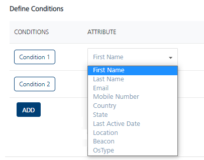 - Attributes: Under the Attributes column, select the attribute from the drop-down list. You can select any user attributes as required. For example, First Name, Last Name, Email, Country, State, Location, Beacon, and any dynamic user attribute.