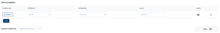 Execute Conditions By: Select the execute condition as Match all conditions or Match any condition from the drop-down list. Based on the fulfilled condition, the system inserts the number of users that qualify for the segment under the Users column.