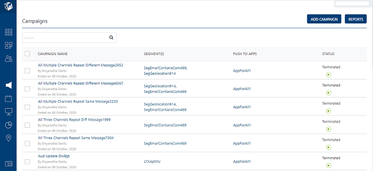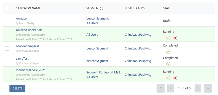 If the campaign is created to run in future, the Campaign home page displays the status as pending in the list view. As an example, the following images displays the Inorbit Mall campaign in running state. Once the campaign duration completes, the status of the campaign changes to completed.