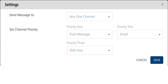 You can create a multi-channel campaign to send users. When you chose at least two notification channels, Engagement Services gives you the option to define notification channel priority. The system displays the Settings window to set the channel priority.