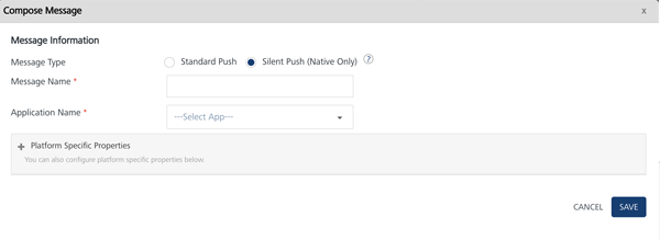 When you check the Silent Push option, the system displays platform-specific properties fields only. This is because the Message Title and the Message Text fields are not applicable for the silent push.