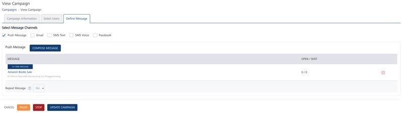 You can pause a campaign either from the Campaigns home page or from the View Campaign > Define Message page. To start a campaign again, you need to change the current campaign status from paused to resume.