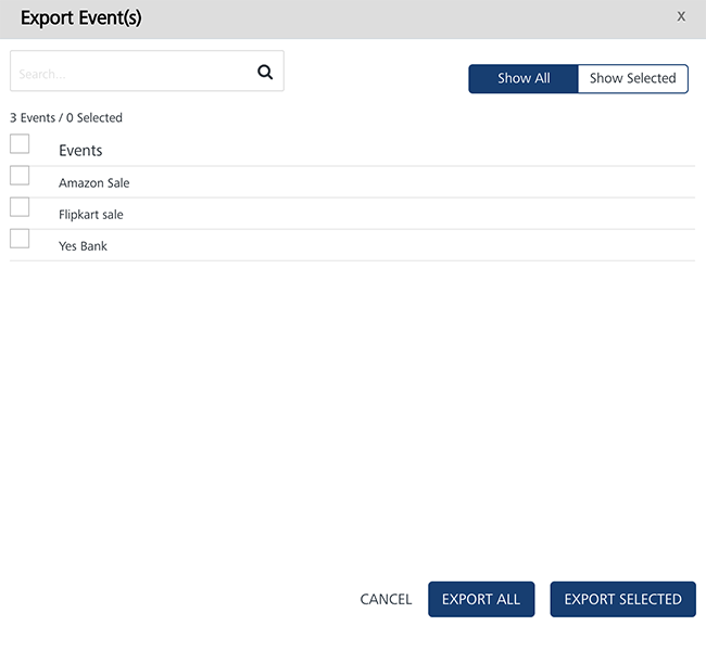 You can export events from Engagement services using the Export Event button. The feature enables you to export events in bulk at one time.