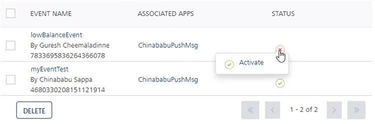 A newly added event appears with the status as Inactive in the list-view. You need to activate an event to send channel notifications to users.
