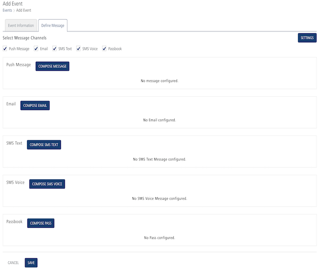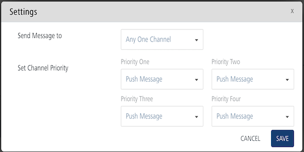 You can set channel priority to send messages to users through the Settings button available on the Events > Define Message page. The Settings button becomes active when you select at least two channels. There are four options available to send messages to users: push message, email, SMS, and Passbook.