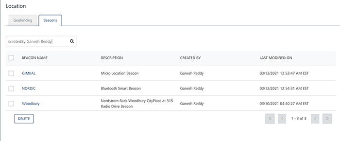 Search field: Click in the search field to view the options to search for a beacon. You can search beacons based on the following criteria: