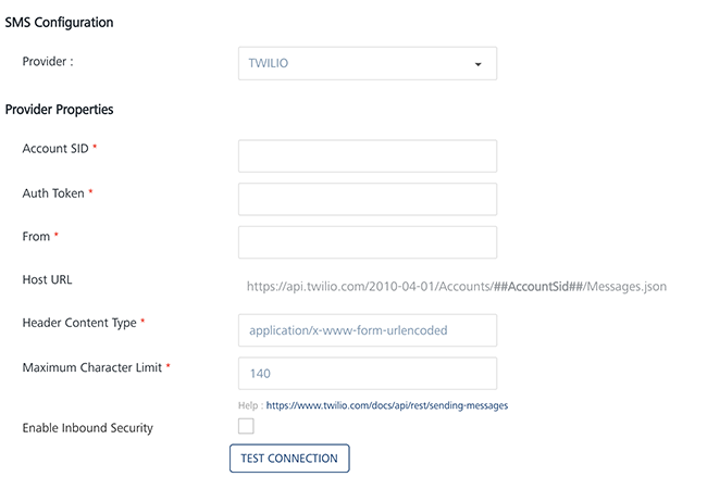 For more details about how to configure the SMS service provider's account, refer: Adding SMS Configuration