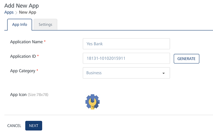 Lisa enters a name for the app such as, Yes Bank and selects the app category from the drop-down list. Lisa clicks Generate to auto generate the Application ID.