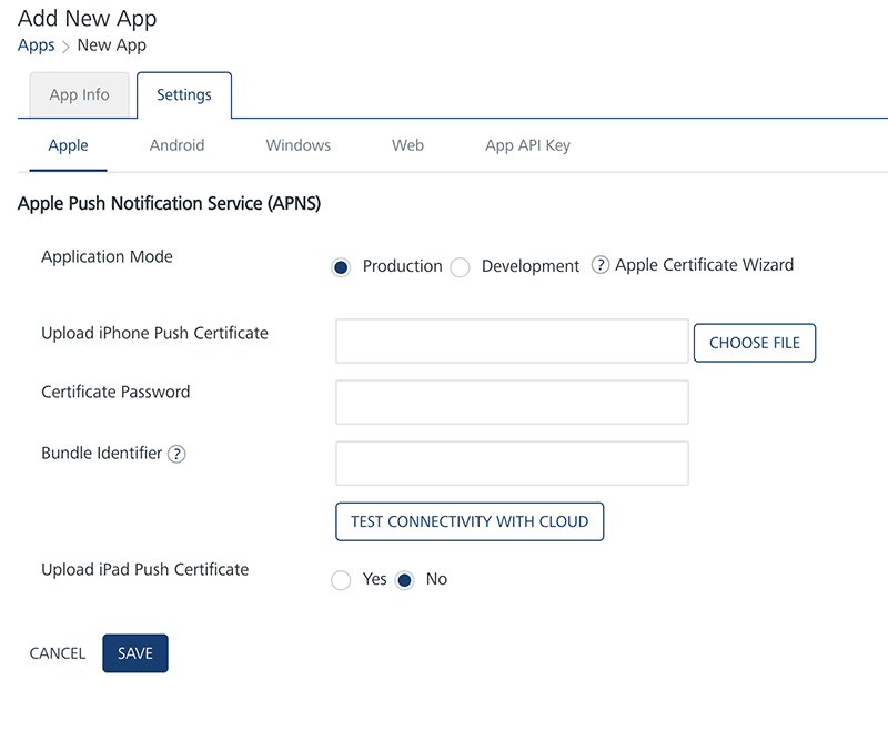 Lisa needs an app to add new customers, and send events through push messages. The app should be developed cross platforms so the event can be received on all the devices (Android, Web, Windows, and iOS). In this section, Lisa learns how to create an app in Engagement server and enable it to send events to customers. There are two basic steps to create an app.