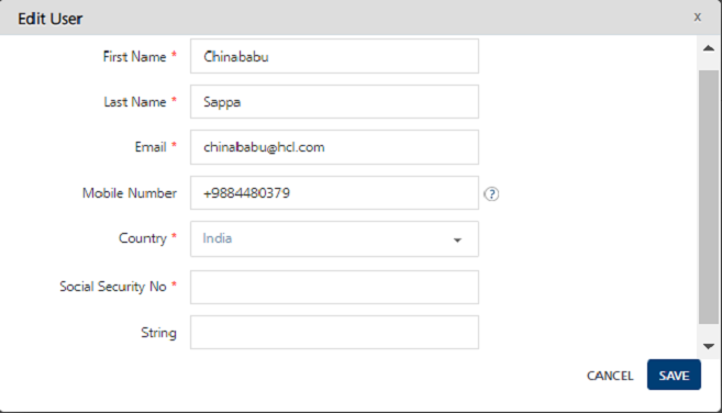 For example, when you edit details of an already existing user Latha Ganesh, you need to specify the Social Security Number. If you do not provide the details, the system displays the warning message that the Social Security Number is required.