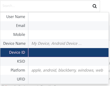 - Search: Click in the Search field to view the available options to search a device. You can search devices based on the following search criteria: