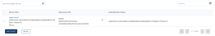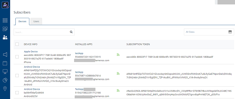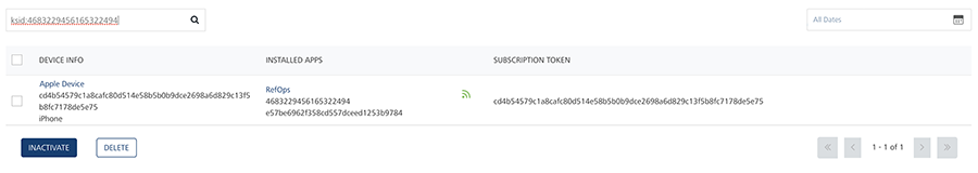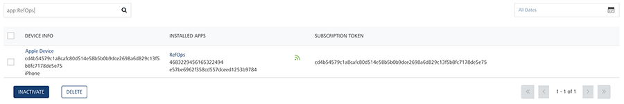 The green subscriber icon indicates that a device is active to that application, and can receive push notifications.