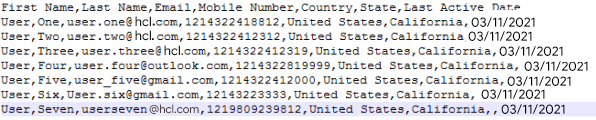 CSVfile, then data entered in your.CSVfile should have all the mandatory fields. For example, the First Name, Last Name, Email, Mobile Number, Country, State, and Last Active Date. You can use alphanumeric and special characters to fill in the data.You can either enter the current date in the