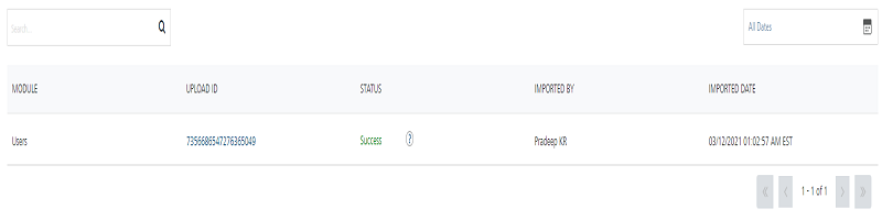 CSVfile.If the file upload is successful, the system displays the confirmation message that the file uploaded successfully and import is in progress. The system also displays the assigned request ID. You can track the uploaded file status through the request ID under the Settings > Status > File Upload section.