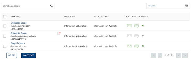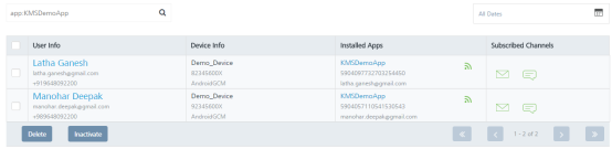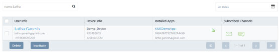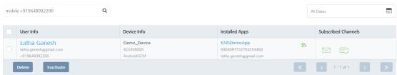 User Element Description User Info The column displays name, email, and mobile number of the added user. The User Info column contains a combination of the First Name and the Last Name of the added user Device Info The column displays the device name, device ID, and the platform name of all the devices that are associated with a user Installed Apps The column displays the app name, UFID and the KSID of each application that is installed on the user’s device Subscribed Channels The column displays the subscribed channels (email or SMS) to which the user has opted in Delete button The button helps you delete users from the list Inactivate Button Helps you inactivate users from the list. Inactivating also causes the user to opt out of email and SMS notifications Display Controls By default, the number range is set to 20 so that only 20 users are displayed in the list view. You can view more users through the forward arrow icon. You can navigate back through the backward arrow icon.