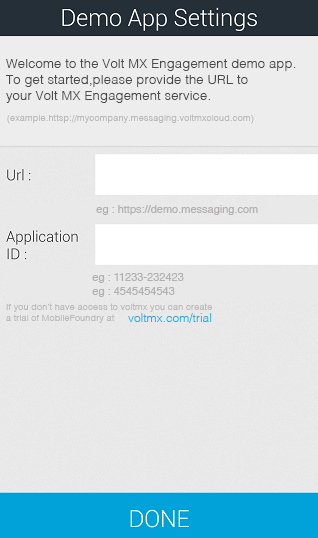 The section explains how to download Volt MX Foundry Engagement demo application from location below and configure the demo client application to receive email, push and SMS notifications.