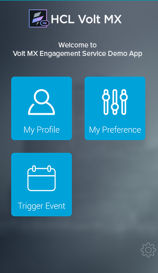 The VoltMX Engagement Service Demo app is installed on your mobile device. The app displays the start screen with the My Profile icon, My Preference icon, and Trigger Event icon.