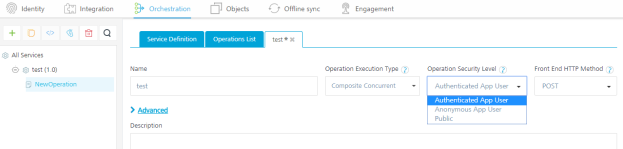 Select one of the following security operations in the Operation Security Level field for integration and orchestration services. By default, the field is set to Authenticated App User: