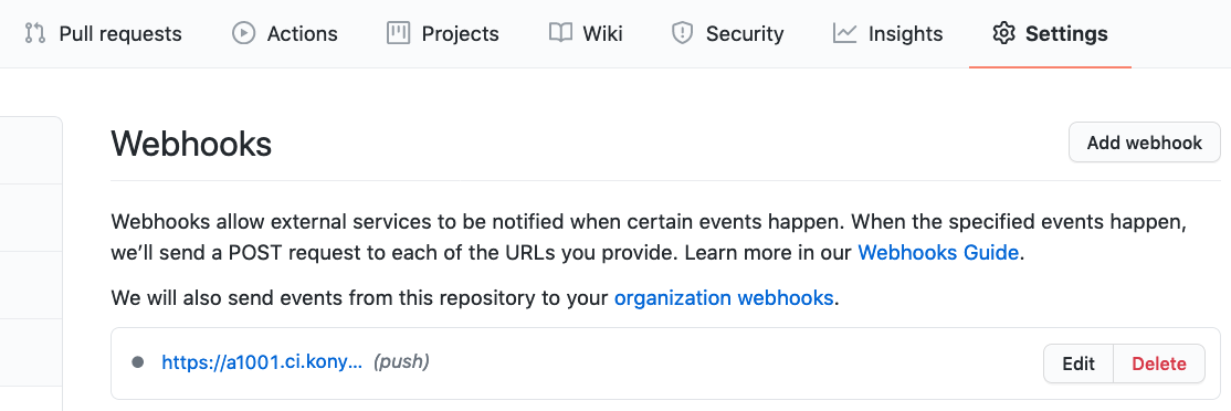 - You can Edit or Delete a Webhook by clicking the respective button. For more information about Webhooks, refer to the GitHub Webhook Documentation.