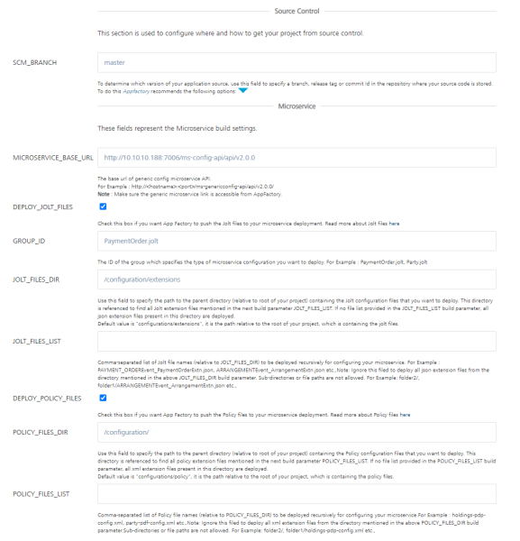 Note: Make sure that the Microservice Base URL is accessible from App Factory.DEPLOY_JOLT_FILES Specifies whether App Factory must build and deploy the Jolt files from the repository. For more information about Jolt files, refer to Oracle Jolt.