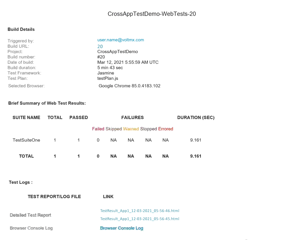 From the VoltMX V9 ServicePack 3 release, App Factory has added support to run tests across multiple apps.From the V9 ServicePack 5 release, you can run cross-app tests for Native channels. You can also run tests across VoltMX apps and non-VoltMX apps.