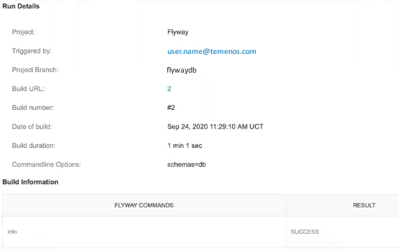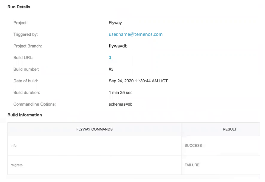 The Build Information section of the email contains the status of individual Flyway commands that were run on the database during the job. The final status of the execution depends on the individual commands.