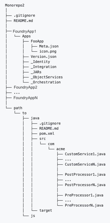 A common practice to create a repository is to use a Monorepo strategy. A Monorepo for App Factory may contain different sub-directories for different Foundry Apps and their Java dependencies, such as Preprocessors, Postprocessors, and Java services. The Monorepo can also contain Maven configuration files (pom.xml) to manage the Java assets and compiling the source to generate binaries.