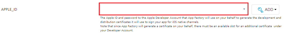 1. While configuring parameters for the buildIrisApp job, next to the APPLE_ID parameter, click ADD.