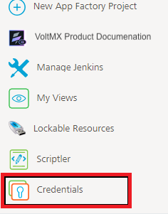 1. On the left pane of the App Factory Console, click Credentials . A list of credentials appears.