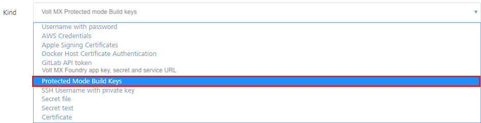 3. In the Add Credentials window, from the Kind list, select Protected Mode Build Keys.