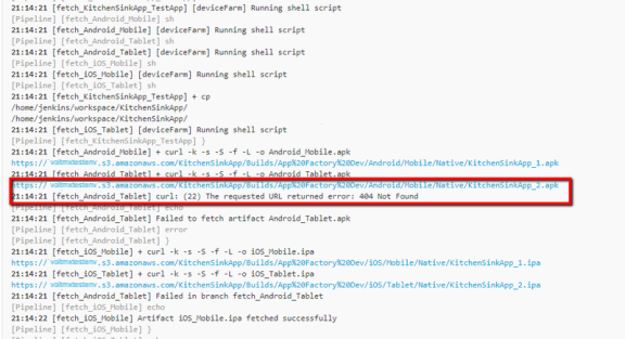 - Scroll to find errors in the log that caused the build to fail. For example, you can trace an error that is related to invalid Android Tablet URL.