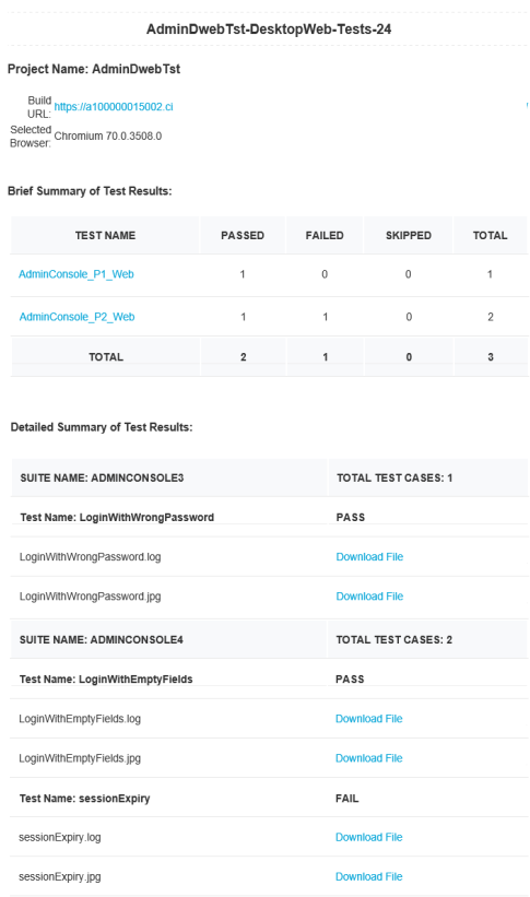 In the final stage, the consolidated test run status is notified via e-mail. Refer the following screenshots for the sample email for consolidated status.