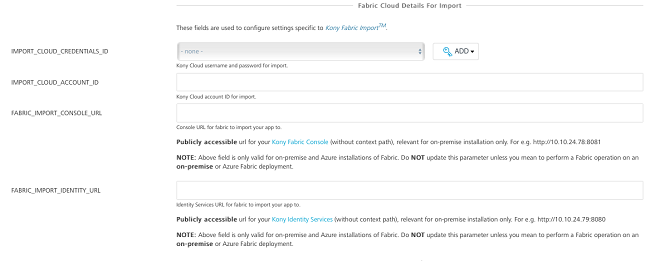 - IMPORT_CLOUD_CREDENTIALS_ID - Volt MX Cloud user name and password for import. Click Add to add cloud credentials. For detailed information on adding cloud credentials, refer Adding New Cloud Credentials.