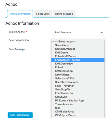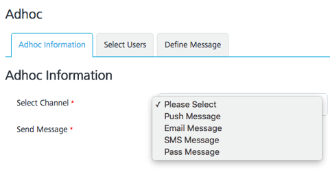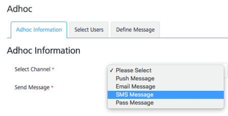 In the Adhoc section, select the SMS Message channel. Click Next –Select Users to navigate to the next screen.