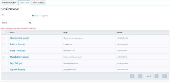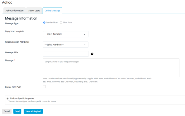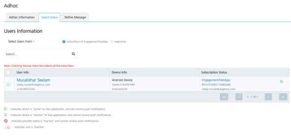 In the Select Users section, choose the Subscribers of EngagementTestApp option and the user to send the message. Click Next –Define Message to navigate to the screen to enter the message to be sent.