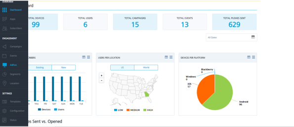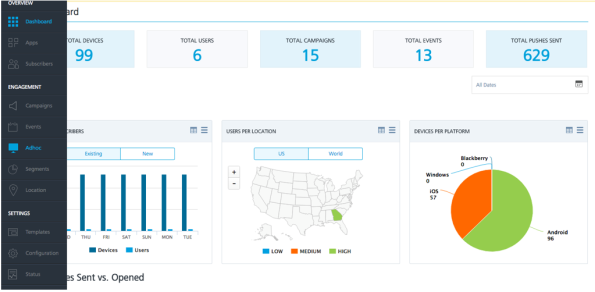 Login to Volt MX Engagement Services console of the Volt MX Foundry. Once the log in is successful, you will see the screen as below. Click Adhoc under the Engagement section from the left pane.