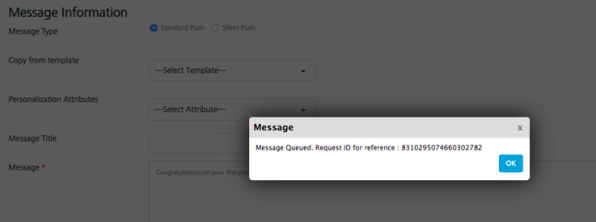 Once the push message has been successfully submitted for delivery, you will see the notification message. Click Ok to continue.