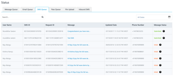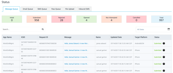 Click the Message Queue tab to view the status of the push messages sent. As you can see from the screen below, the first message in the list is what was submitted earlier. The status of this message indicates that it was successfully submitted.