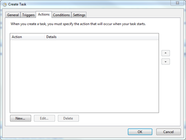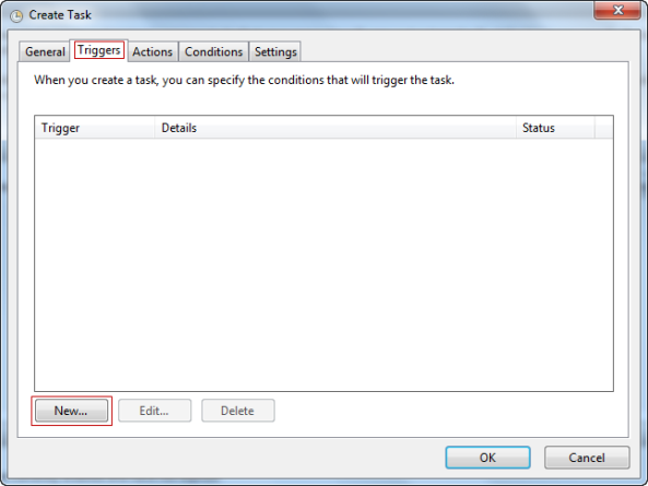 The Create Task window appears. The Create Task window includes five tabs: General, Triggers, Actions, Conditions and Settings. By default, the General tab is set to active.