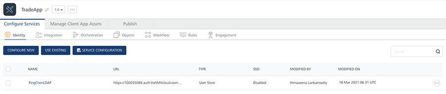 Assume the BankApp uses theUser Store identity service and the TradeApp uses the Open LDAP identity service in their Volt MX Foundry backend.
