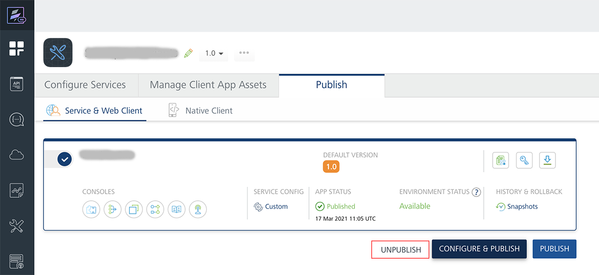 When you publish apps in the Console, the apps are published with the Asynchronous publish mode. By default, the asynchronous publish is enabled. When asynchronous publish is initiated, the Publish dialog can be closed and the app publish process continues in the background. The Asynchronous publish helps you to unblock the user interface (UI) when an app publish is in progress. While the app is in asynchronous publish progress, you can continue work in the console such as creating or modifying other apps and services. When you publish apps, your apps are published to clouds or environments.