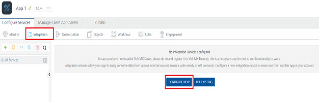 After you create an application, in the Configure Services tab, click the Integration service tab. The Integration page appears and lists the existing integration services (if any).